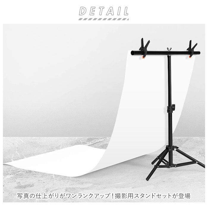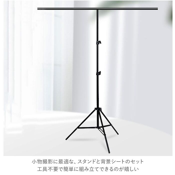 ・小物撮影に最適な、スタンドと背景シートのセット。工具不要で簡単に組み立てできるのが嬉しい。