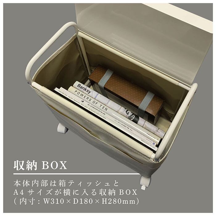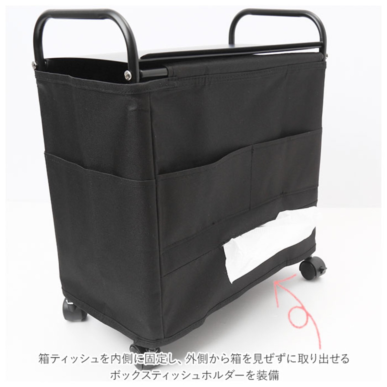 ・箱ティッシュを内側に固定し、外側から箱を見ぜずに取り出せるボックスティッシュホルダーを装備。