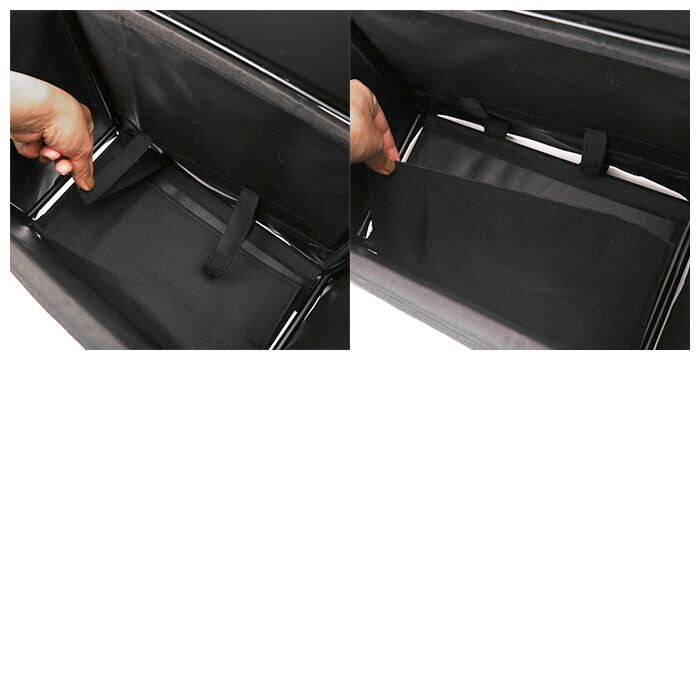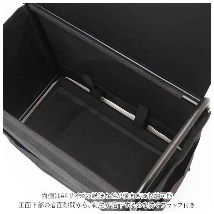 ・内側はA4サイズの雑誌などが横向きに収納可能。正面下部の底面隙間から、荷物が落下するのを防ぐフラップ付き。