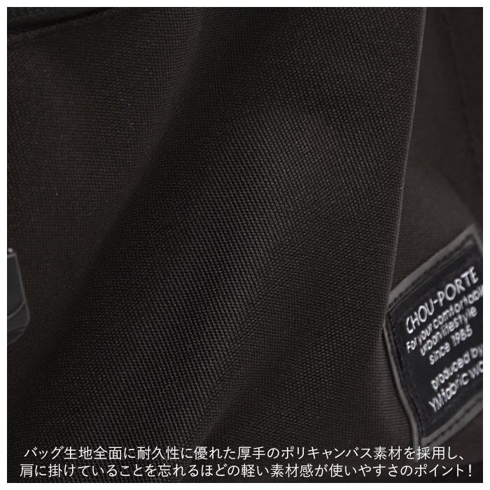 ・バッグ生地全面に耐久性に優れた厚手のポリキャンバス素材を採用し、肩に掛けていることを忘れるほどの軽い素材感が使いやすさのポイント!