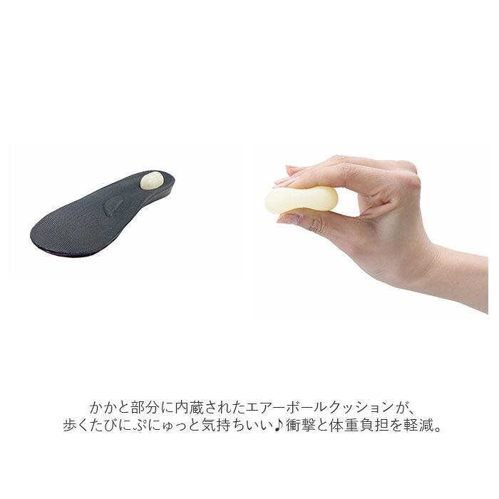 ・かかと部分に内蔵されたエアーボールクッションが、歩くたびにぷにゅっと気持ちいい♪衝撃と体重負担を軽減。