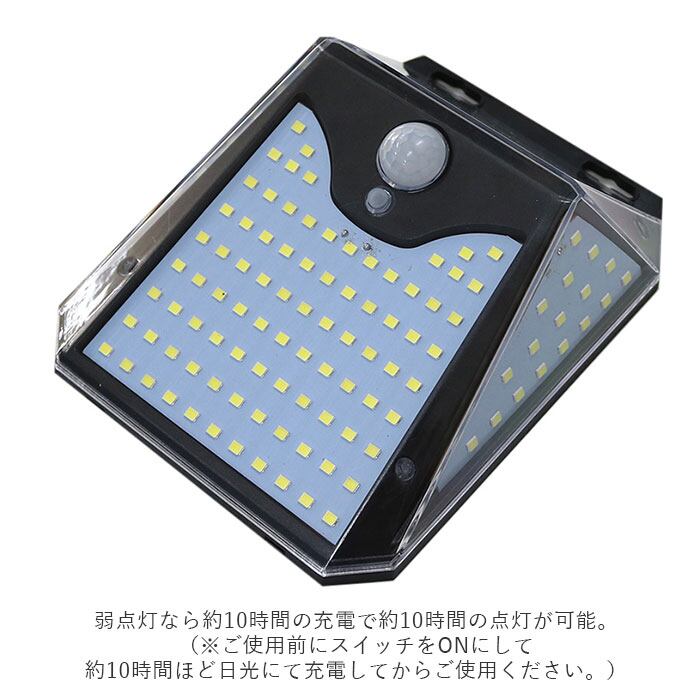 ・また、弱点灯なら約10時間の充電で約10時間の点灯が可能。(※ご使用前にスイッチをONにして約10時間ほど日光にて充電してからご使用ください。)