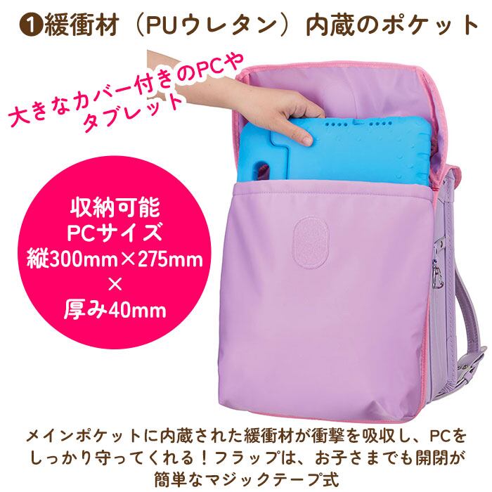 ・メインポケットに内蔵された緩衝材(PUウレタン)が衝撃を吸収し、PCをしっかり守ってくれる!フラップは、お子さまでも開閉が簡単なマジックテープ式。
