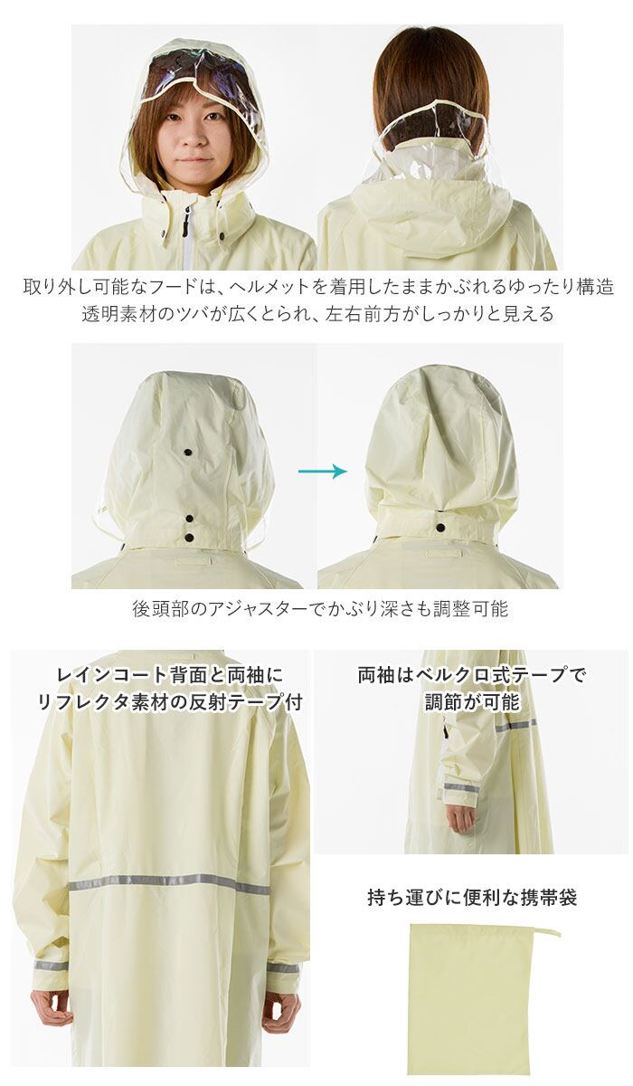 ・レインコート背面と両袖にリフレクタ素材の反射テープ付きで、早朝や夜間でもすれ違う車からの視認性が高くなり、安全性を確保。