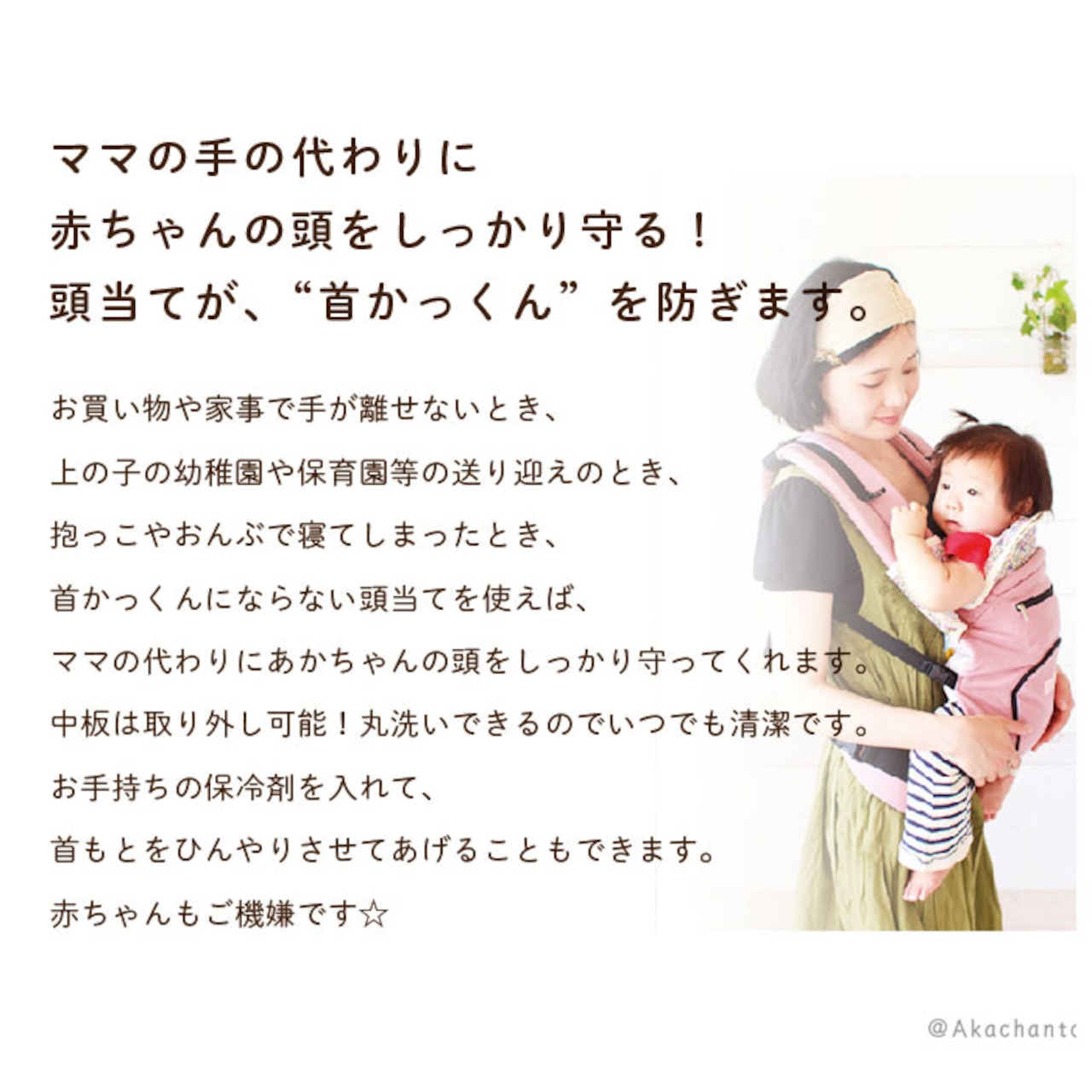 ・赤ちゃんのおんぶひもや抱っこひもに簡単に取り付けられる、首かっくんにならない頭あて セパレートタイプ。