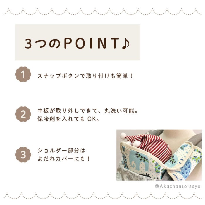 ・中板が入っているところはスナップボタンで開くので、タオルにくるんだ保冷剤を入れたりすれば暑さ対策も◎寒い季節には防寒対策もできる♪