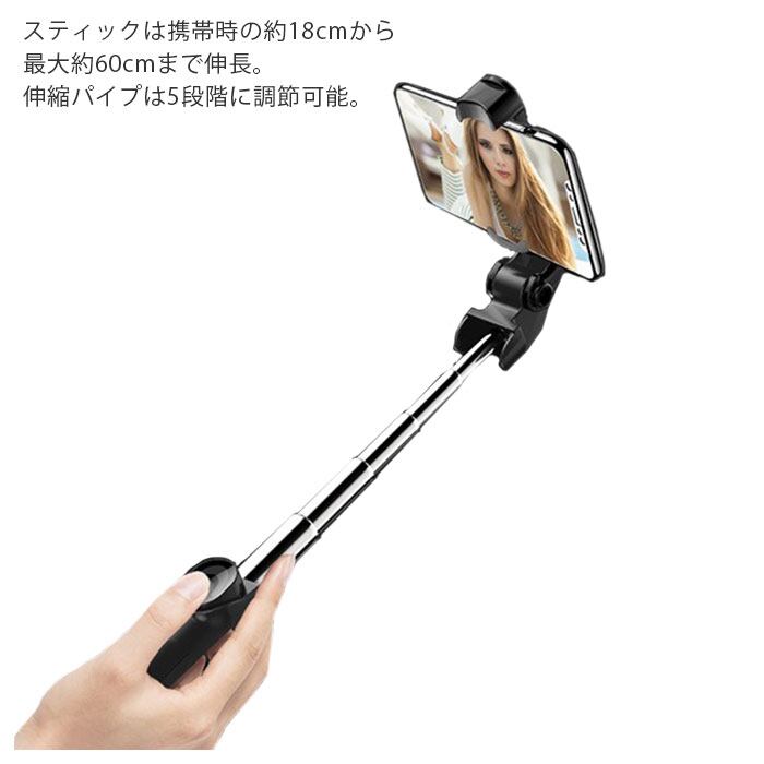 ・セルフィースティックの全長は、携帯時約18cmのコンパクトサイズから最大約60cmまでぐ〜んと伸長。伸縮パイプは5段階に調節ができ、記念スナップから動画撮影まで画角調整が自在。(※最大サイズはスマホホルダーを含まない、スティックのみの全長です。)