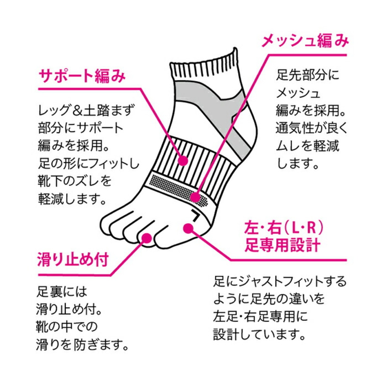 ・レッグ・土踏まず部分は、足の形にフィットし靴下のズレを軽減するサポート編み、足先部分は通気性の良いメッシュ編みを採用。