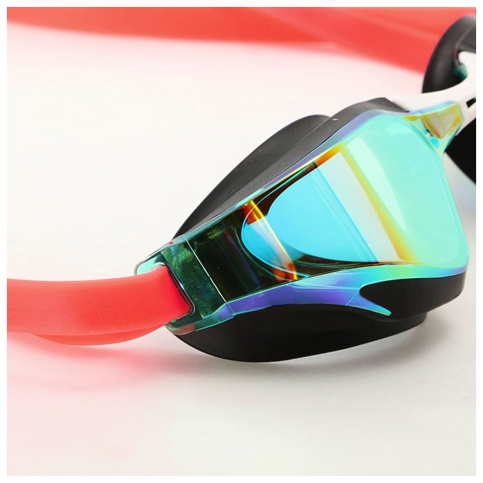 ・日本人の顔の形状に合わせた3Dクッションでフィット感を向上させ、飛び込みでのズレや水漏れのリスクを軽減させる高密着クッション付レーシングゴーグル。