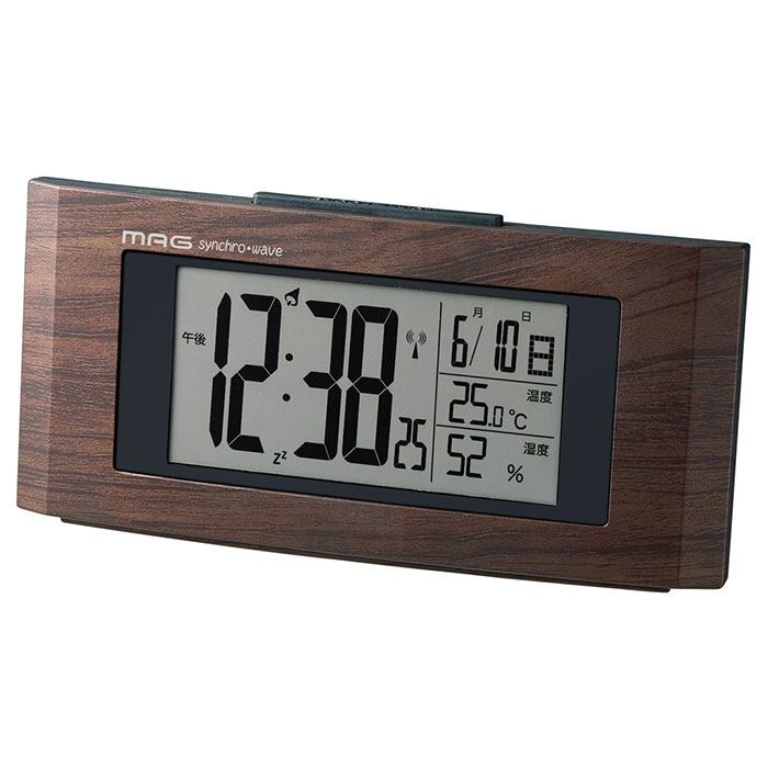 ・インテリアになじみやすい、スマートな木目調のデザインのデジタル置時計