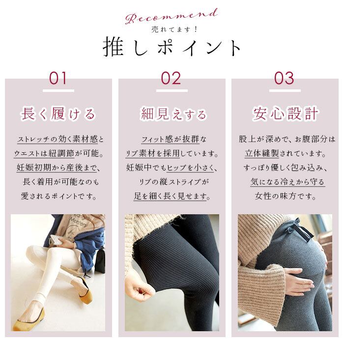 ・お腹まわりを優しく包み込んで、お腹が大きな時期だってもっとお洒落に!着心地抜群のマタニティレディース・スパッツ。