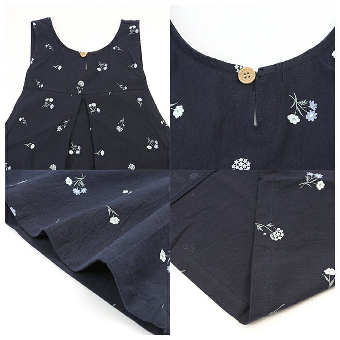 【チュニック】…袖口が大きく開いたノースリーブデザイン。フロントには2つの大きめポケットを配置。首の後ろについたボタンを留めるだけの簡単仕様。