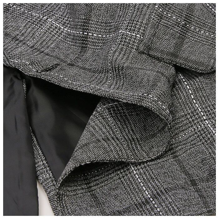 ・グレンチェック柄がおしゃれな、ジャケットとパンツのセットアップ。薄手のサラッとした生地感で、インナーを替えてオールシーズン着られるのが嬉しい。