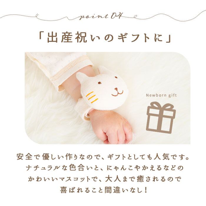 ・ナチュラルな色合いと、にゃんこやかえるなど可愛いマスコットをかたどったフォルムで、出産祝いにもぴったり。
