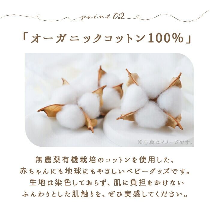 ・農薬や化学肥料を使わずに育てられたオーガニックコットン100%の生地で作られた、ふわふわで柔らかい肌触り。肌がデリケートな赤ちゃんにも安心。