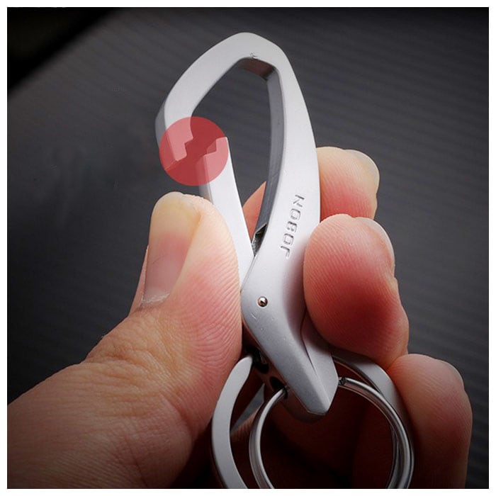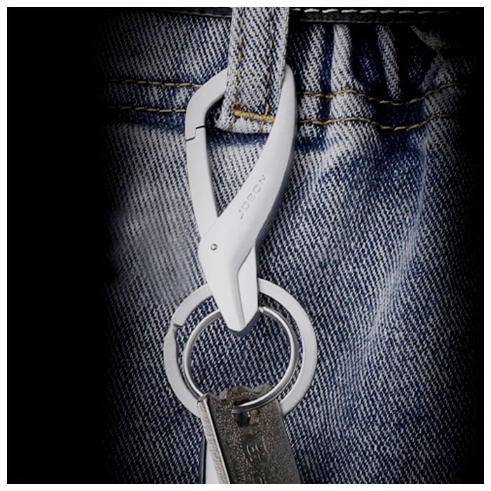 ・丈夫で戻りの良いバネを使用したカラビナフックを採用し、パンツのベルトループやバッグのハンドルなどにしっかりと取り付けが可能。