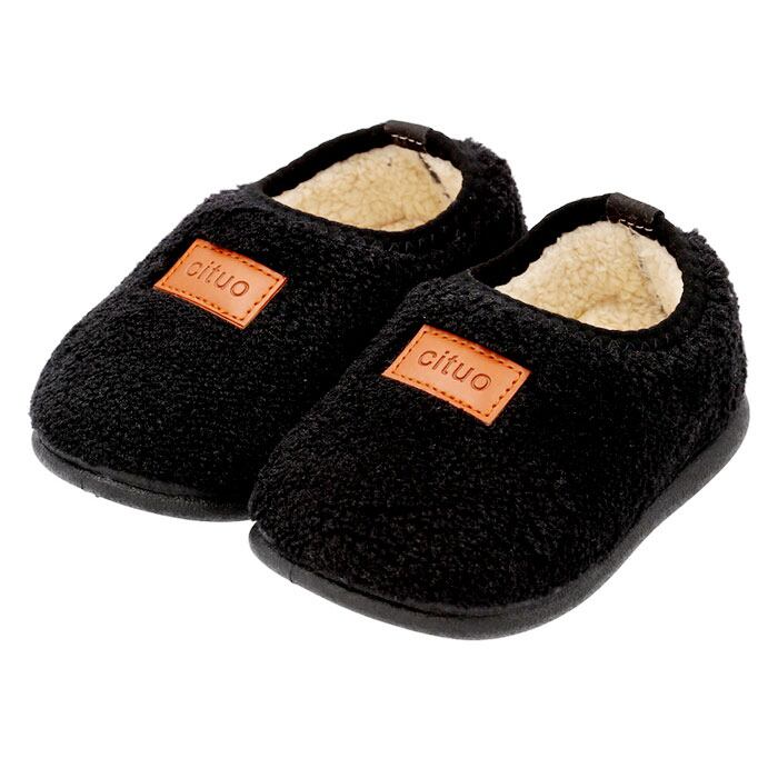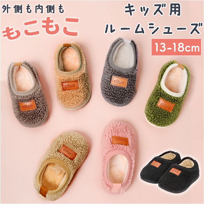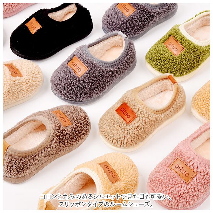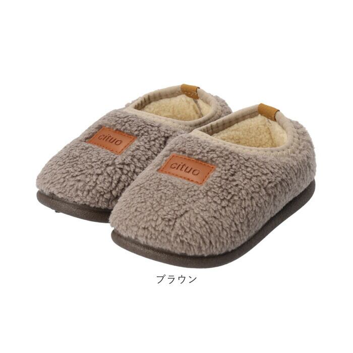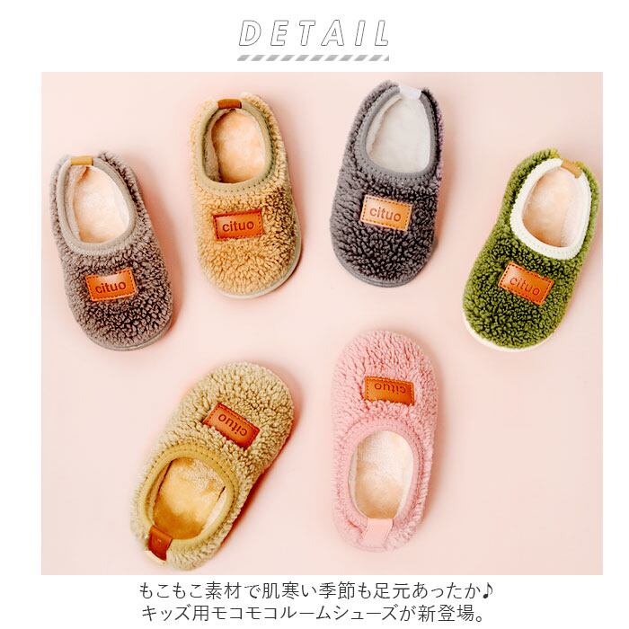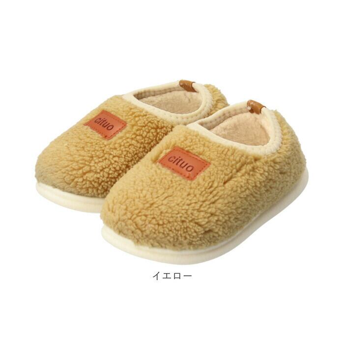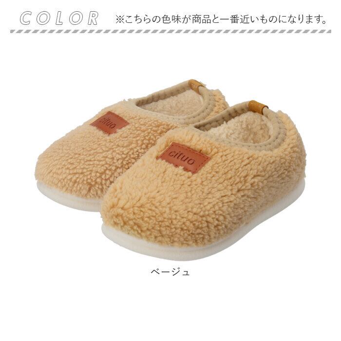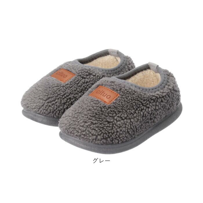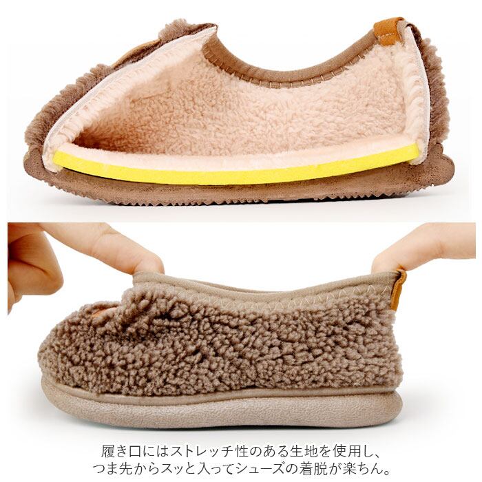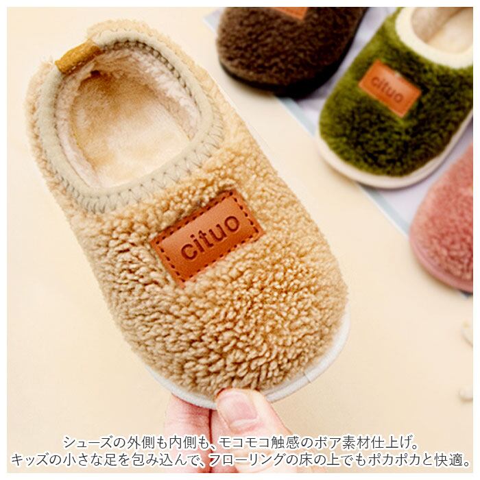 ・シューズの外側も内側も、モコモコ触感のボア素材仕上げ。キッズの小さな足を包み込んで、フローリングの床の上でもポカポカと快適。