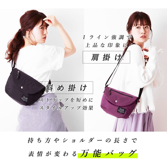・開閉のしやすいマグネットタイプのフラップは、個性的な半円アーチ状のデザイン。小物の出し入れがとってもラクちん。