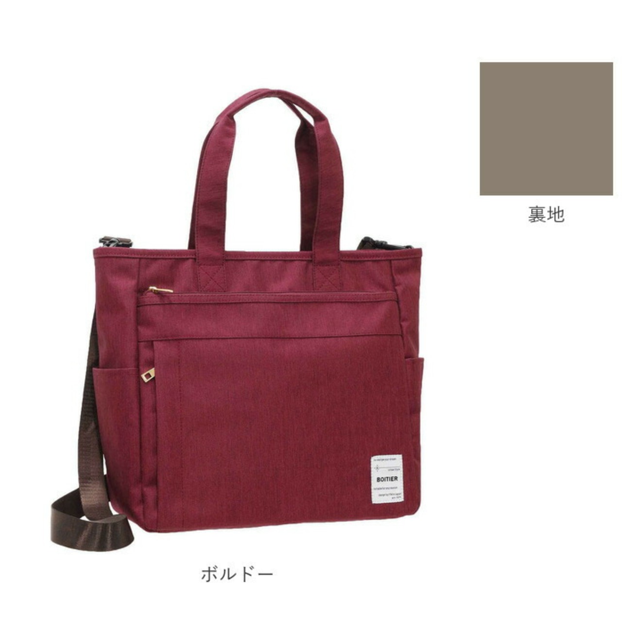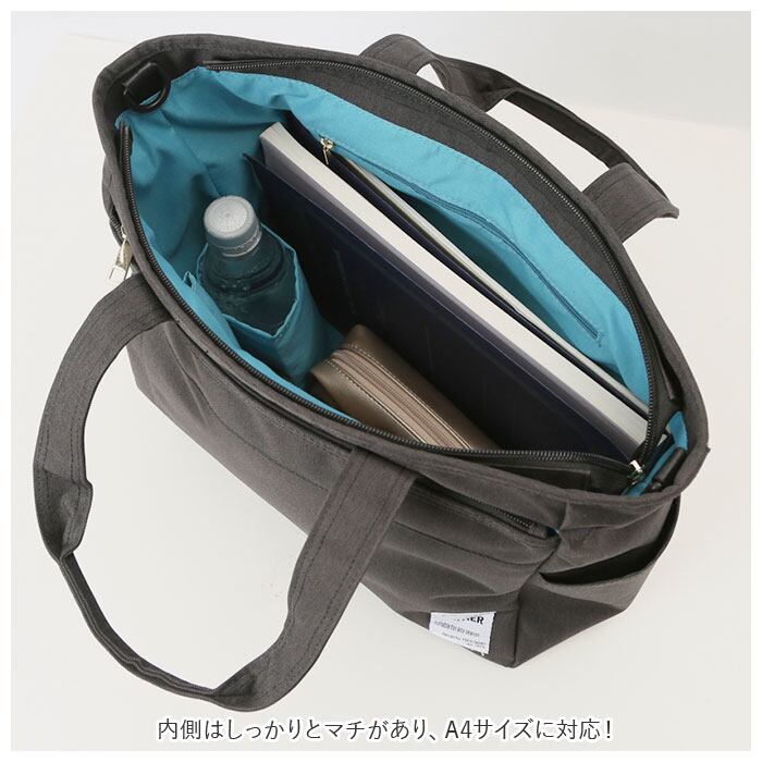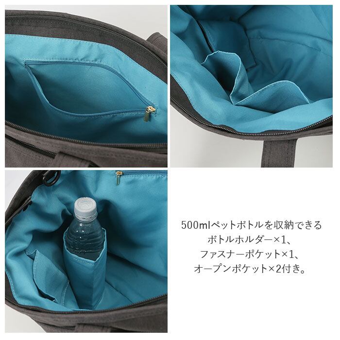 ・内側はしっかりとマチがあり、A4サイズに対応!500mlペットボトルを立てて収納できるボトルホルダー×1、ファスナーポケット×1、オープンポケット×2付き。