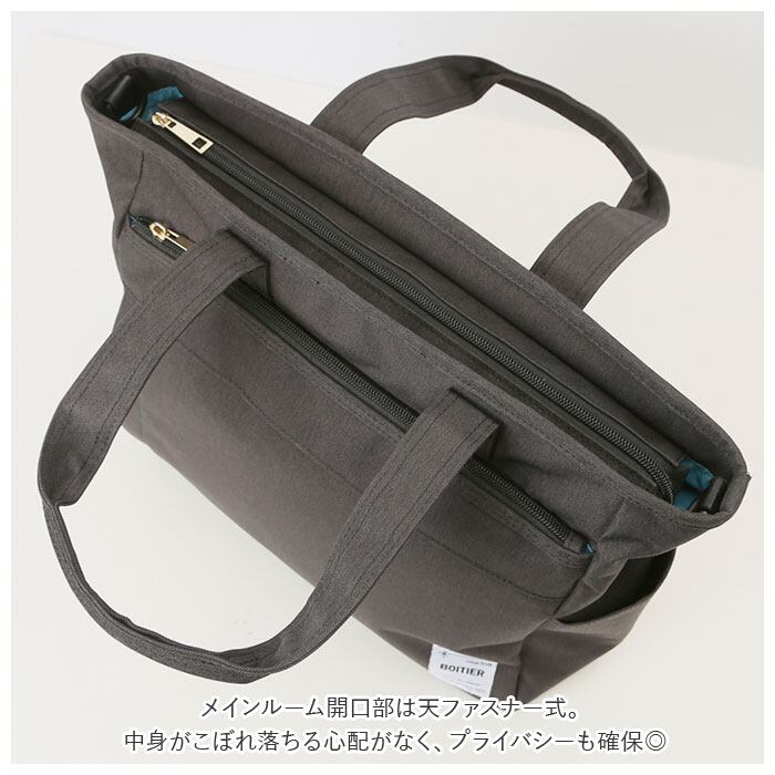・メインルーム開口部は天ファスナー式。中身がこぼれ落ちる心配がなく、プライバシーも確保◎