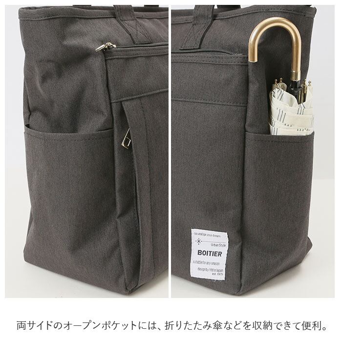 ・両サイドのオープンポケットには、折りたたみ傘などを収納できて便利。