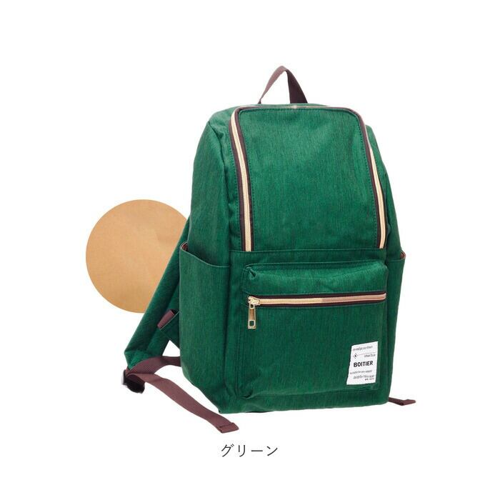 ・外側にはフロントにファスナーポケットの他、両サイドに水筒や折りたたみ傘を収納するのにちょうどいいオープンポケットが2つ付いて便利。