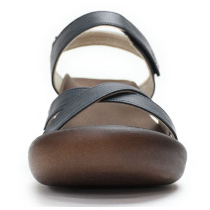 ・コロンと丸みを帯びたフォルムが印象的なソールと、クロスしたベルトがスタイリッシュなウェッジソールサンダル。