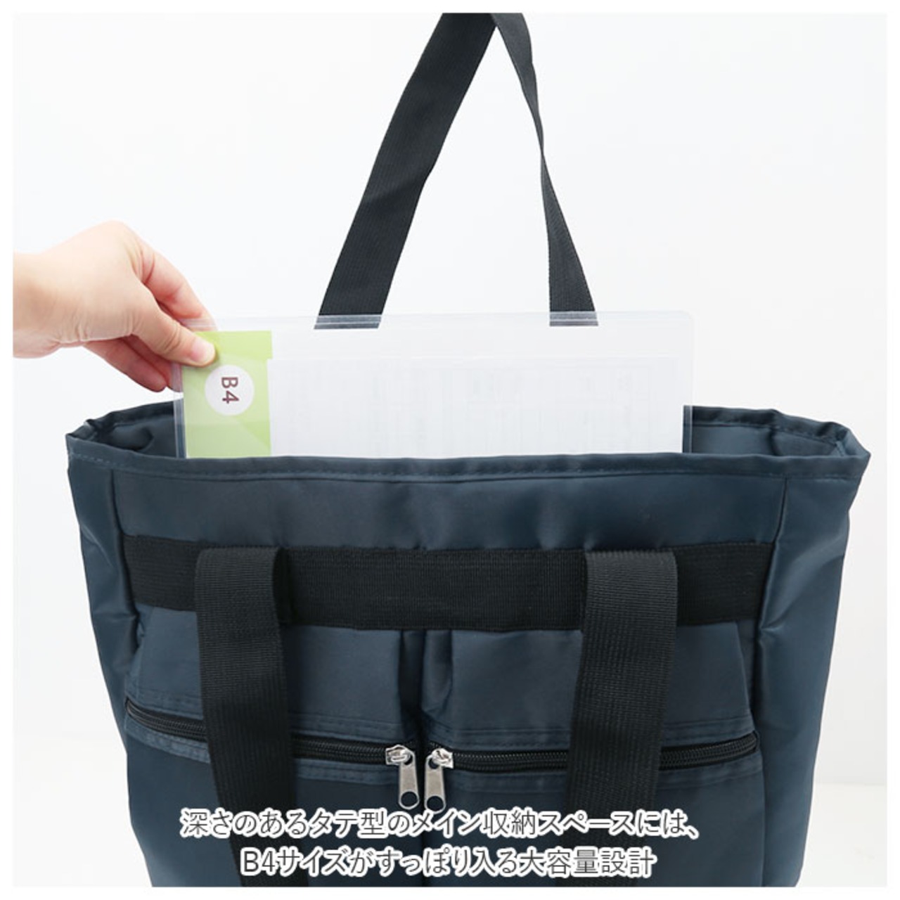 ・深さのあるタテ型のメイン収納スペースには、B4サイズがすっぽり入る大容量設計。荷物が安定した状態で持ち運べる底板付きで、ランチボックスもスッキリ収納可能!