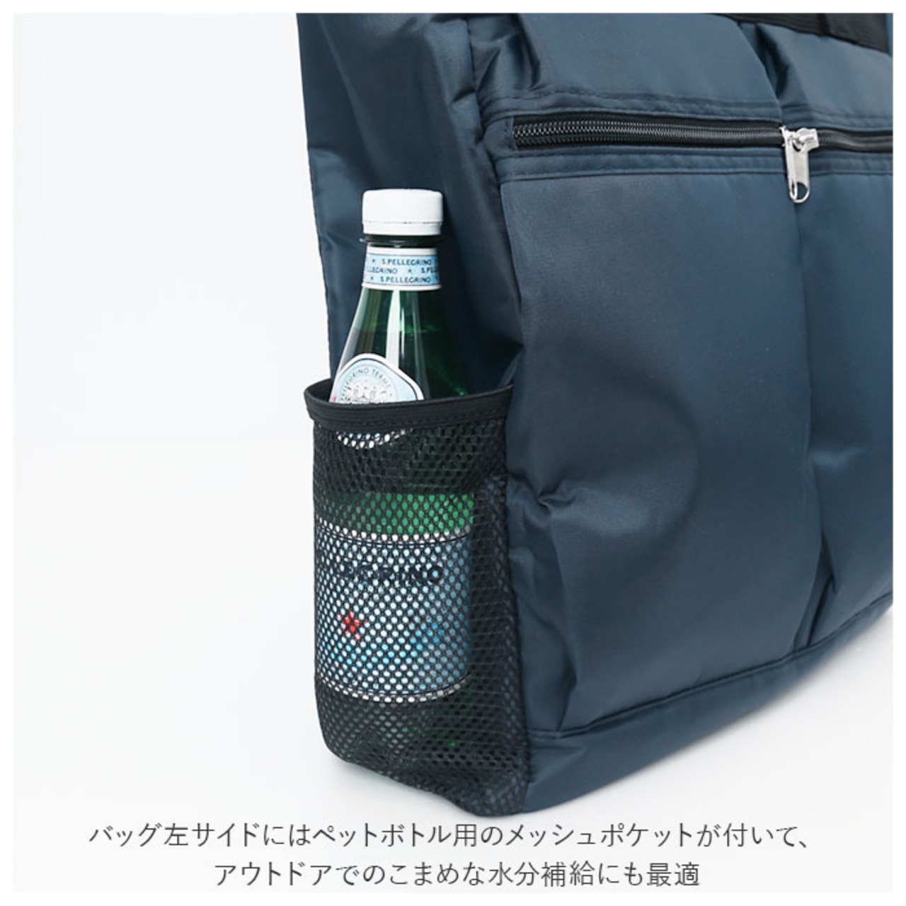・さらに、バッグ左サイドにはペットボトル用のメッシュポケットが付いて、アウトドアでのこまめな水分補給にも最適。
