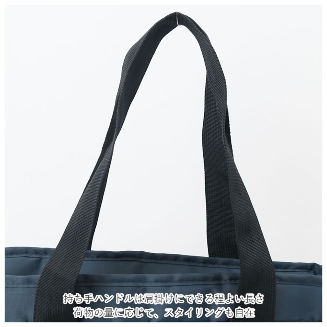 ・持ち手ハンドルは肩掛けにできる程よい長さ。荷物の量に応じて、スタイリングも自在。