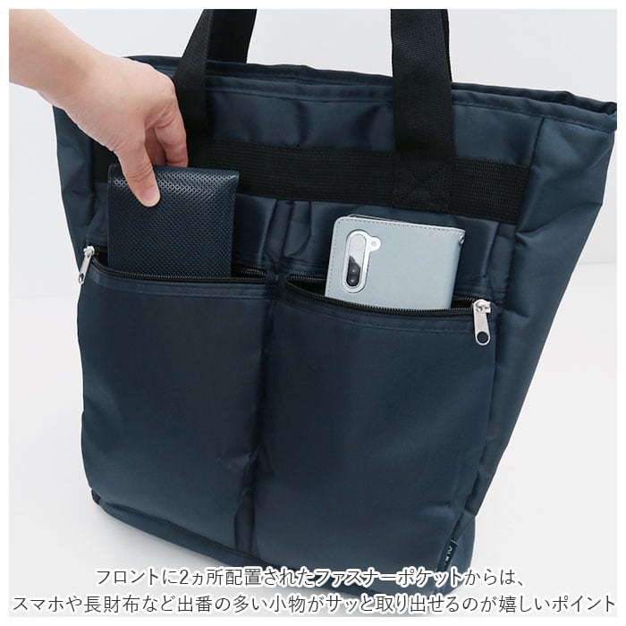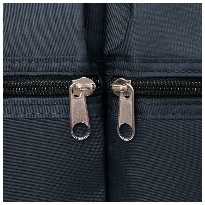 ・フロントに2ヵ所配置されたファスナーポケットからは、スマホや長財布など出番の多い小物がサッと取り出せるのが嬉しいポイント!