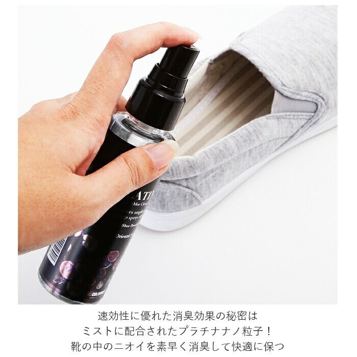 ・速効性に優れた消臭効果の秘密は、ミストに配合されたプラチナナノ粒子!靴の中のニオイを素早く消臭して快適に保つ。