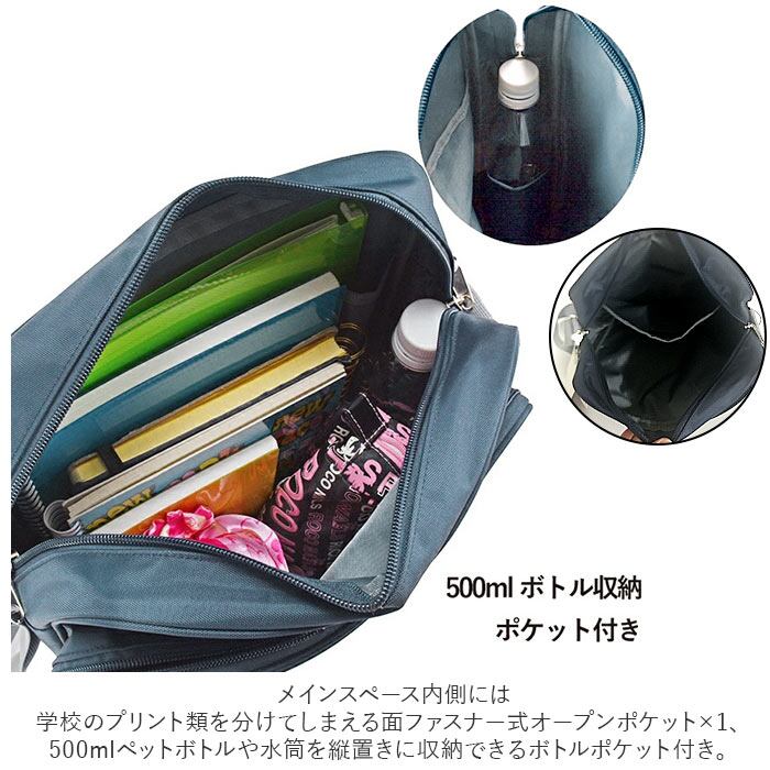・メインスペース内側には学校のプリント類を分けてしまえる面ファスナー式オープンポケット×1、500mlペットボトルや水筒を縦置きに収納できるボトルポケット付き。