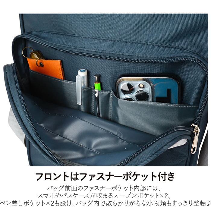 ・バッグ前面のファスナーポケット内部には、スマホやパスケースが収まるオープンポケット×2、ペン差しポケット×2も設け、バッグ内で散らかりがちな小物類もすっきり整頓♪