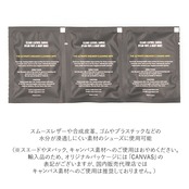 ・スムースレザーや合成皮革、ゴムやプラスチックなどの水分が浸透しにくい素材のシューズに使用可能。(※スエードやヌバック、キャンバス素材へのご使用はおやめください。輸入品のため、オリジナルパッケージには「CANVAS」の表記がございますが、国内販売代理店ではキャンバス素材へのご使用は推奨しておりません。)