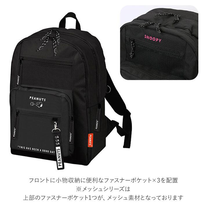 ・フロントに小物収納に便利なファスナーポケット×3を配置。(※メッシュシリーズは上部のファスナーポケット1つが、メッシュ素材となっております。)