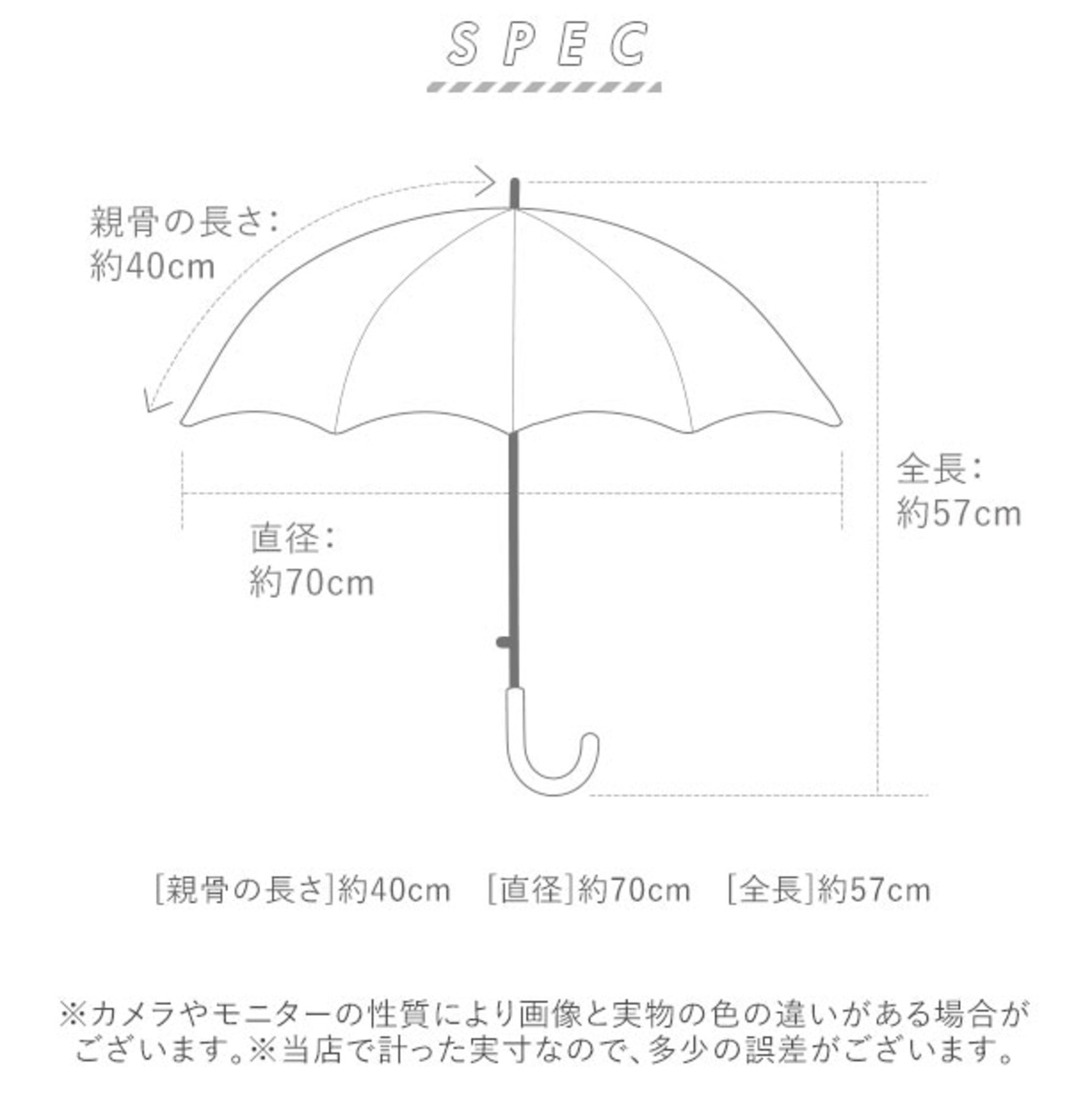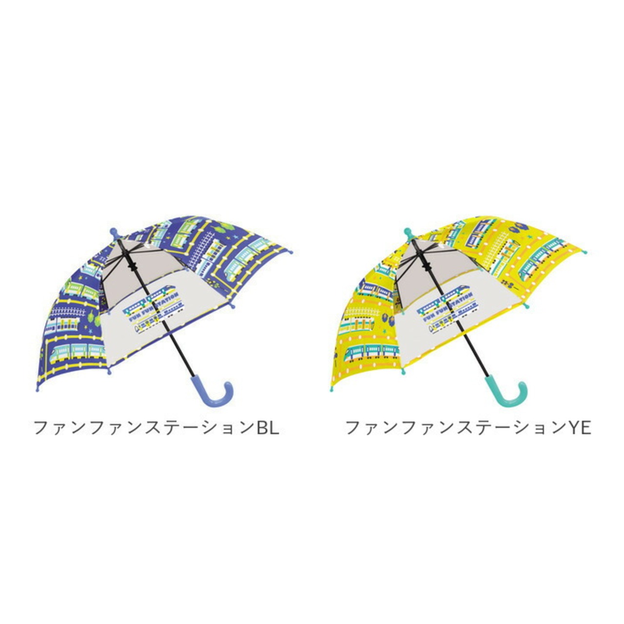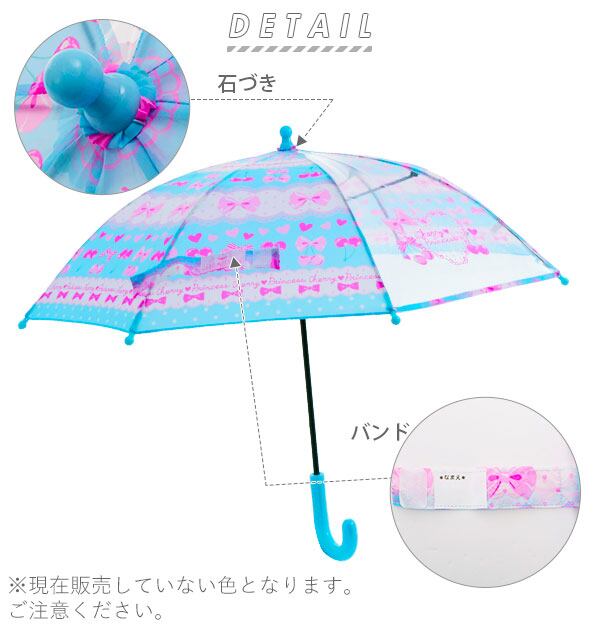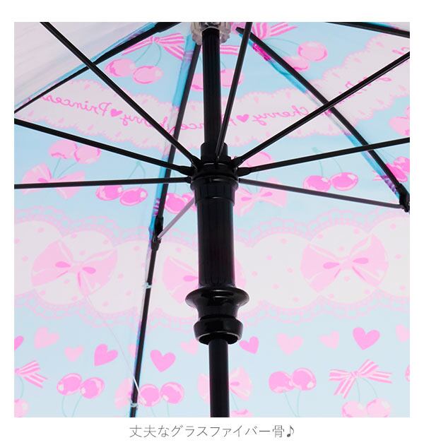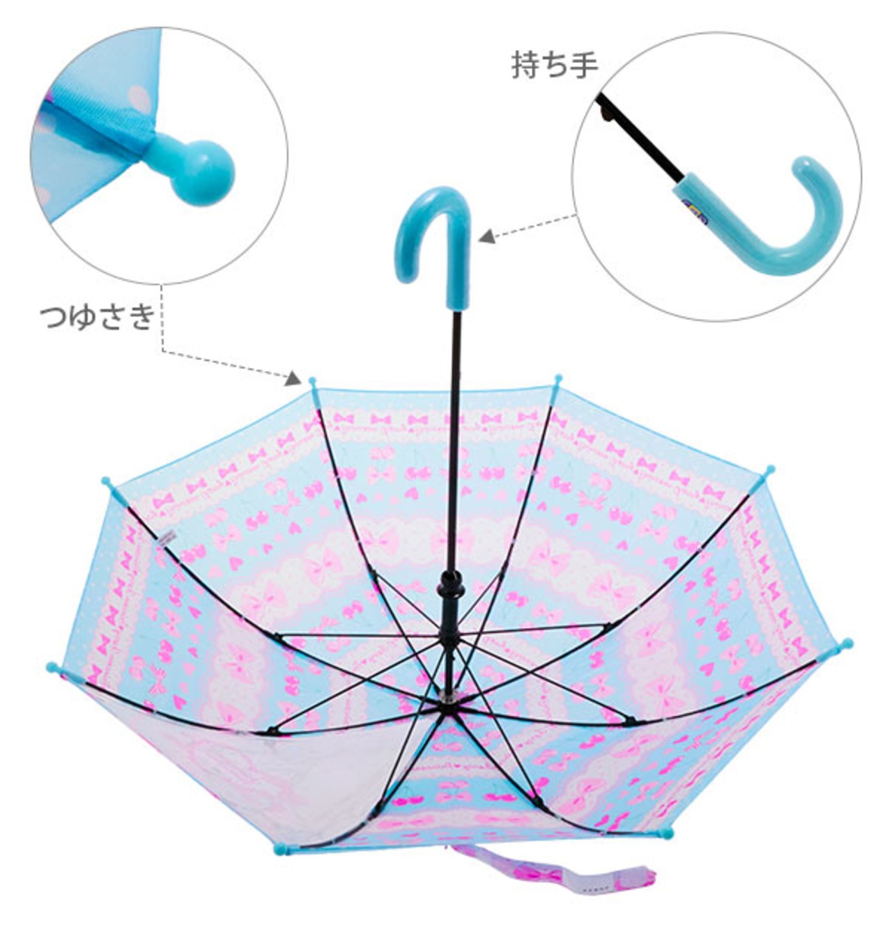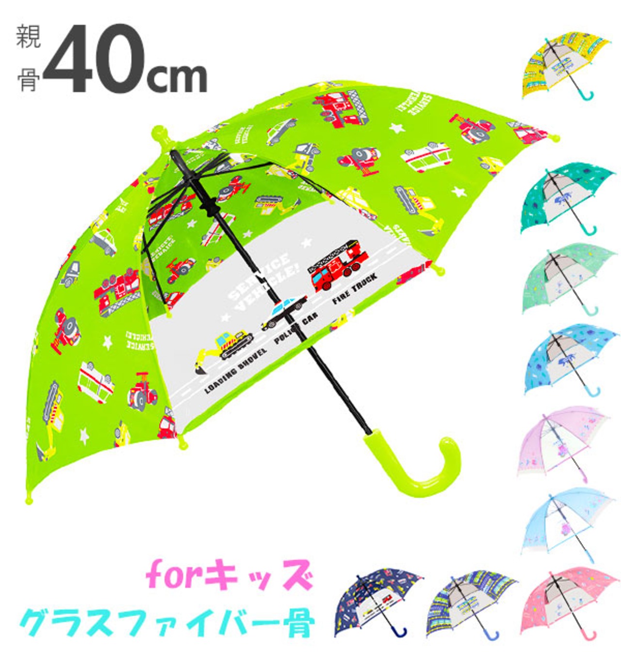 親骨40cmサイズ、風に強いグラスファイバー骨のキッズ用長傘です。弾力性があり折れにくい素材になっています。透明窓があるので、前が見えて安全です。軽量で、傘をまとめるテープにはお名前ラベル付きです。