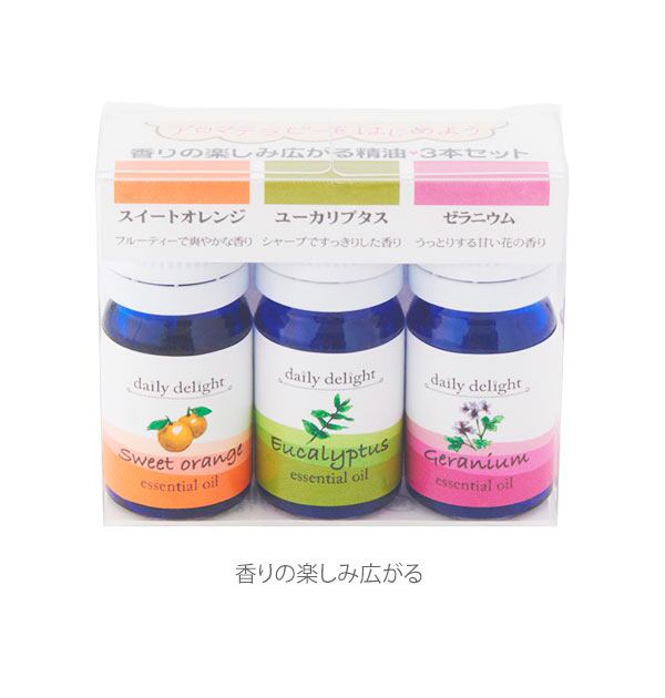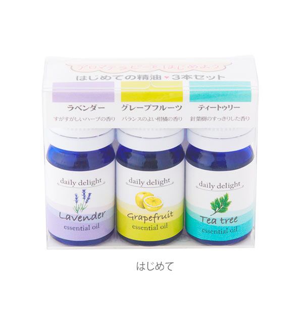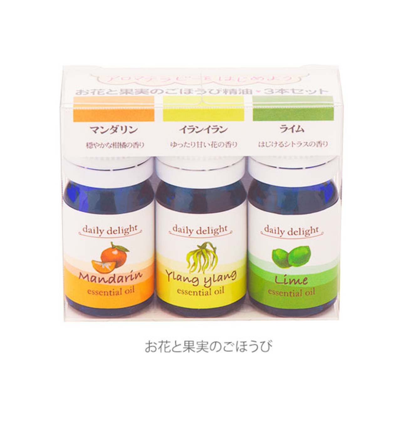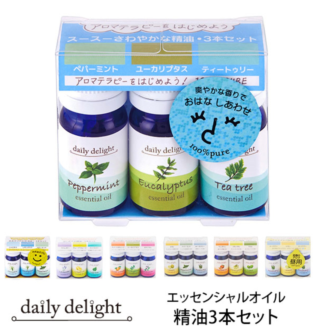 daily delight デイリーディライトのアロマオイル、スターターセットです。セットの種類は、初めての精油、すっきりさわやか、香りの楽しみ、お花と果実のご褒美の4種類。アロマテラピーを初めて楽しみたい方や、気分にあったアロマのセットをお探しの方に。リップバームやねり香水、アロマオイルで人気のデイリーディライトのアロマセットです。