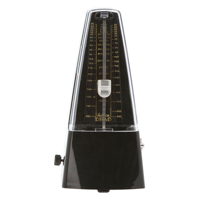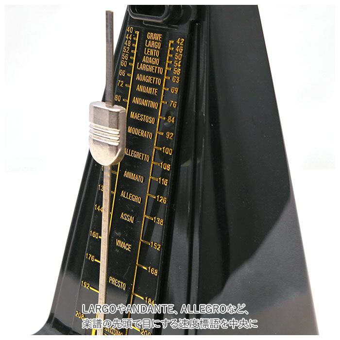 ・正面の目盛りプレートには、1分間に刻まれる4分音符の数を示す「メトロノーム記号」をBPM40〜BPM208まで、数字で読みやすく表示。