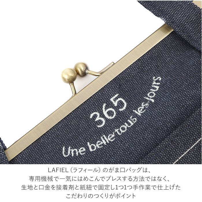 ・LAFIEL(ラフィール)のがま口バッグは、専用機械で一気にはめこんでプレスする方法ではなく、生地と口金を接着剤と紙紐で固定し1つ1つ手作業で仕上げたこだわりのつくりがポイント。