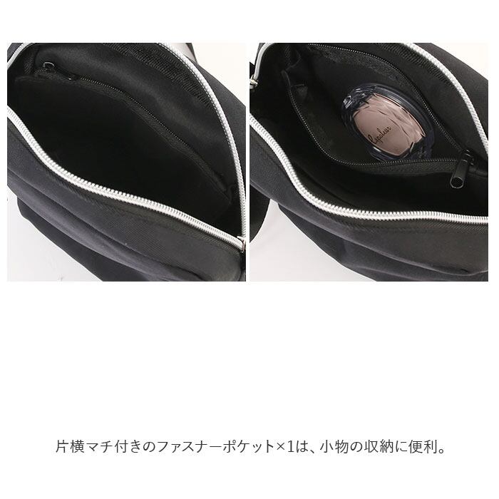 ・片横マチ付きのファスナーポケット×1は、小物の収納に便利。