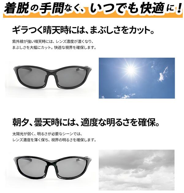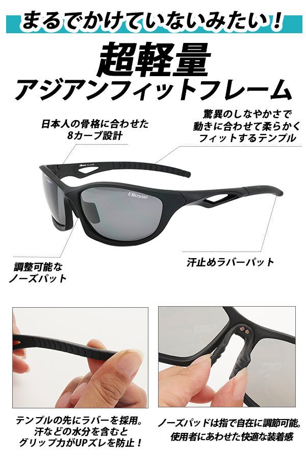 エレッセの偏光調光レンズのサングラス。まぶしい乱反射をカットし、裸眼では見えないクリアな視界でゴルフの芝目、釣りの水中や運転時の道路などをみやすくします。偏光度99%、紫外線カット率99.9%以上。しなやかなテンプルで長時間かけても快適です。ノーズパッドは指で調節可能。テンプルの先はラバーを採用しており、水分を含むとグリップ力が高まります。
