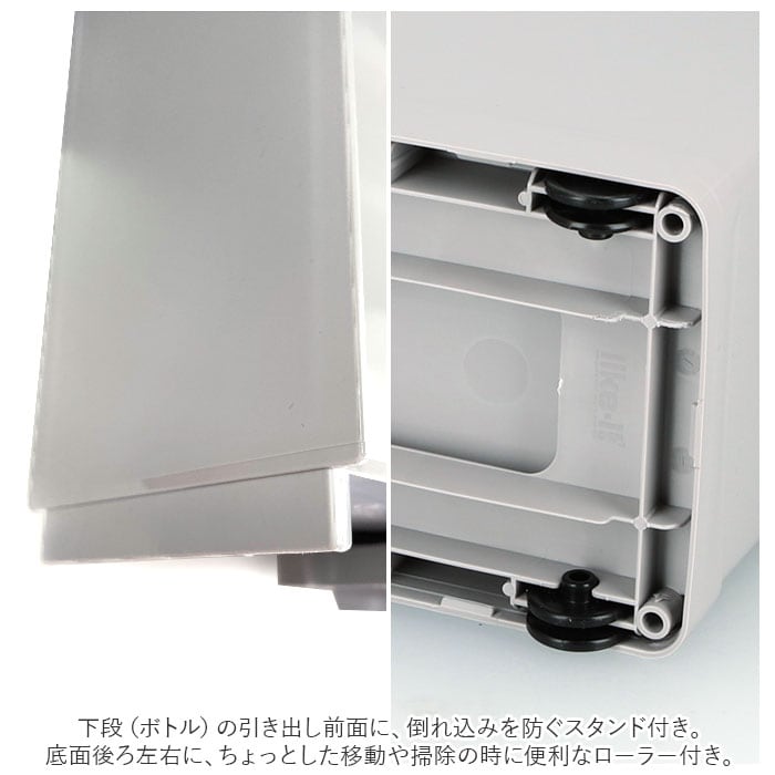 ・下段(ボトル)の引き出し前面に、倒れ込みを防ぐスタンド付き。
