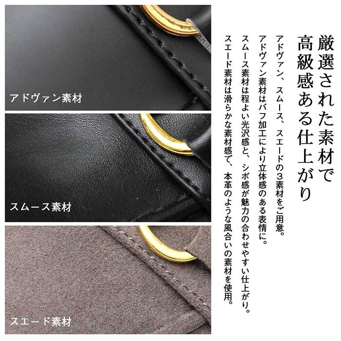 ・立体感と美しい艶を出すアドヴァン素材、シーンを選ばない程よい艶感とシボ感で万能なスムース素材、ナチュラルな雰囲気で立体感のある毛羽立ちのスエード素材、と表情の異なる3種類の素材を展開。