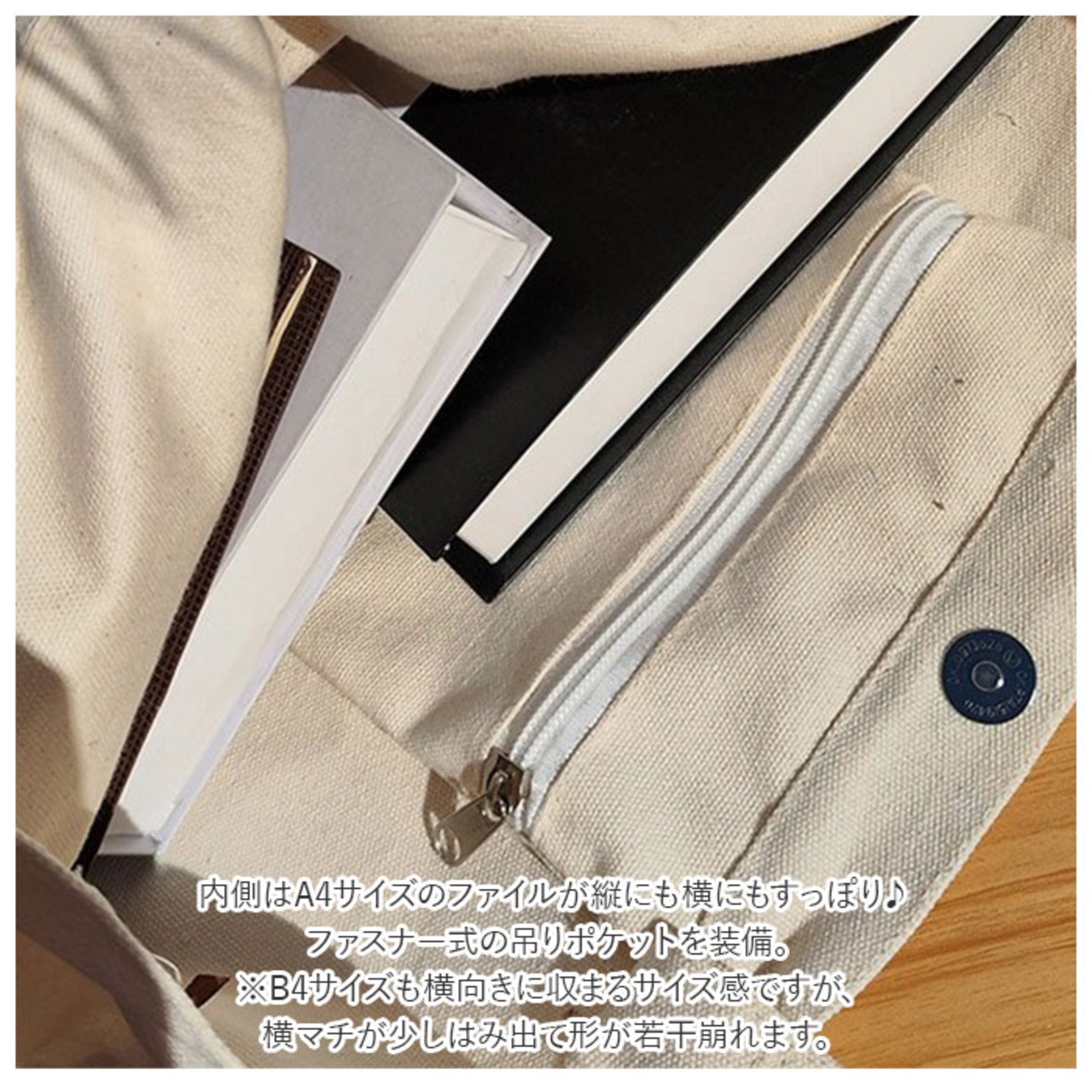 ・内側はA4サイズのファイルが縦にも横にもすっぽり♪ファスナー式の吊りポケットを装備。(※B4サイズも横向きに収まるサイズ感ですが、横マチが少しはみ出て形が若干崩れます。)