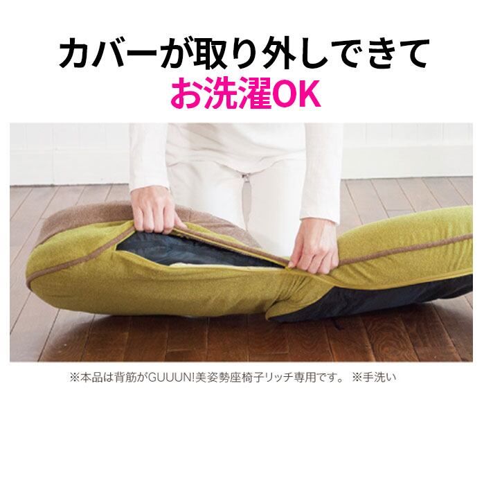 ・美姿勢座椅子リッチでは、本体からカバーが取り外しが可能!カバーが手軽にお洗濯できていつでも清潔!(※40度以下のぬるま湯での手洗いでのお洗濯をお勧めします。)