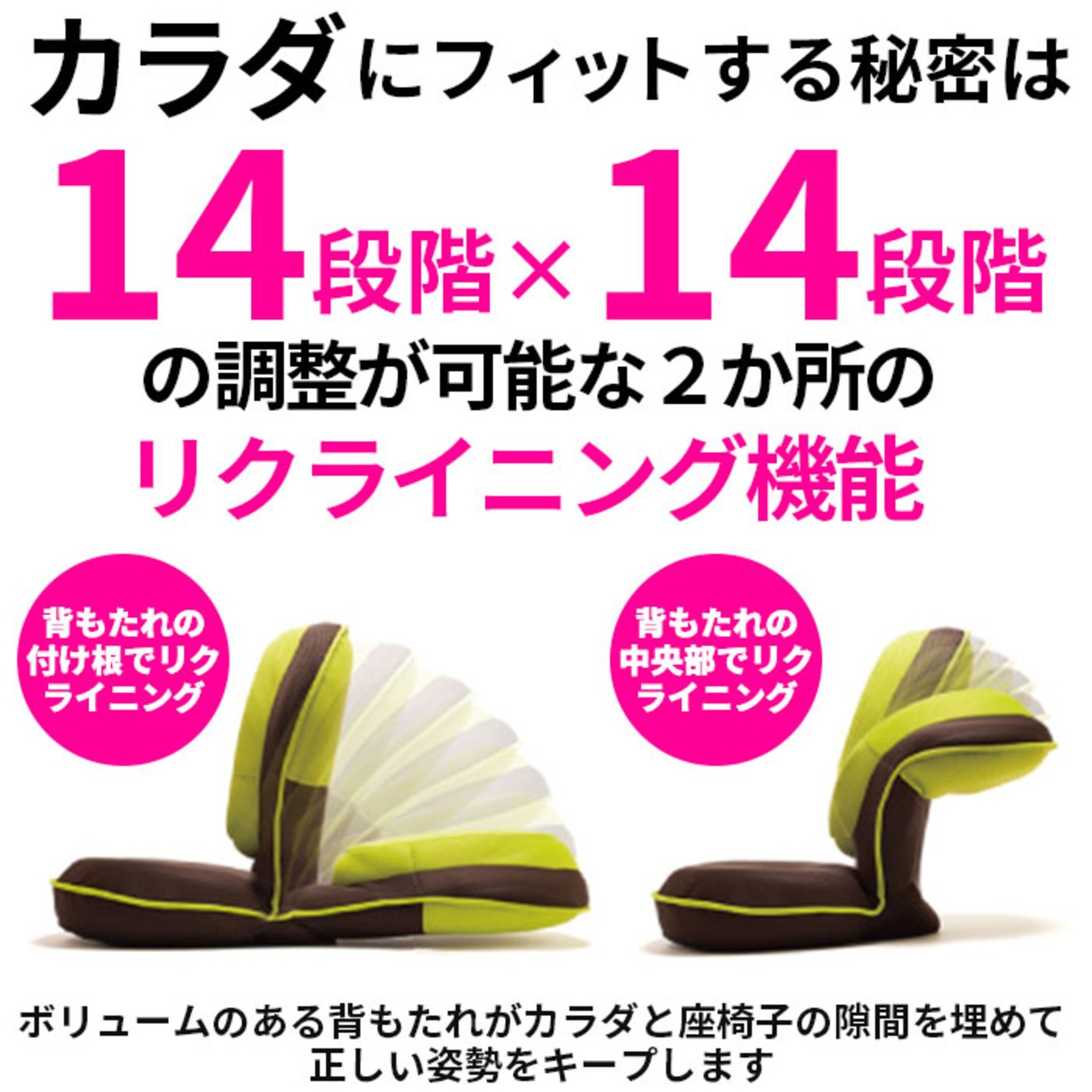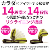 ・背中と腰、2ヶ所のリクライニングがそれぞれ14段階に調節可能。196通りに変身自在なので、どんな座り方でもゆったり身体がリラックス!