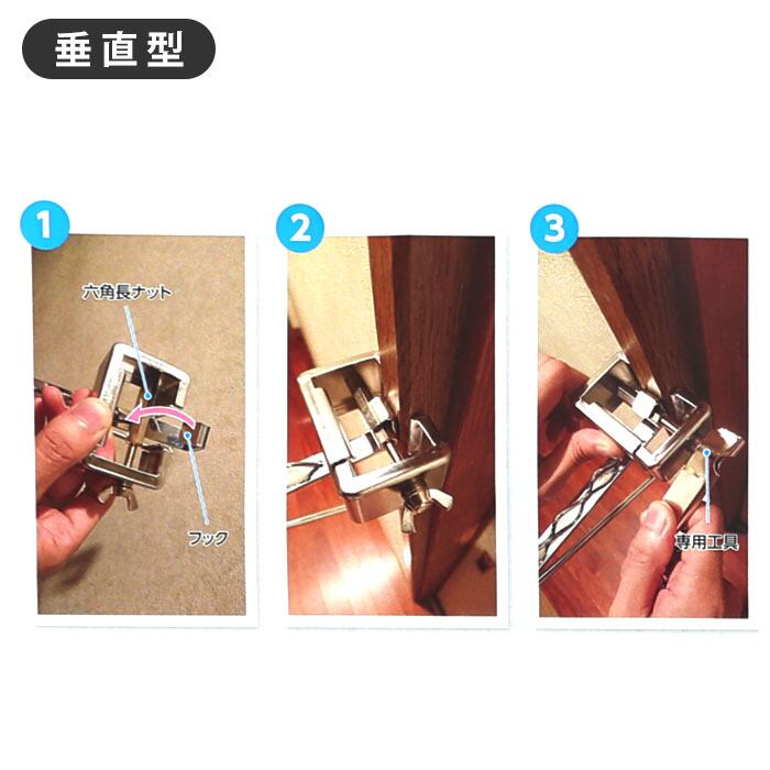 ・ピンチ金具で設置場所の建具を挟んで、蝶ネジを締めるだけの簡単仕様。蝶ネジは専用工具で増し締めすることができるため、女性でもしっかりと固定可能。(※強力な力で締めあげるため、深さ約1mm、直径2mm程度の跡が建具につくことがあります。予めご了承ください。)