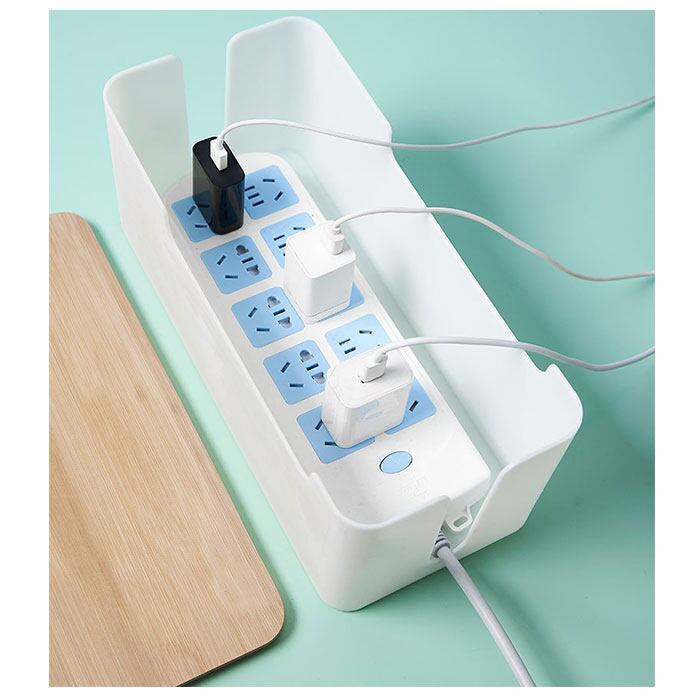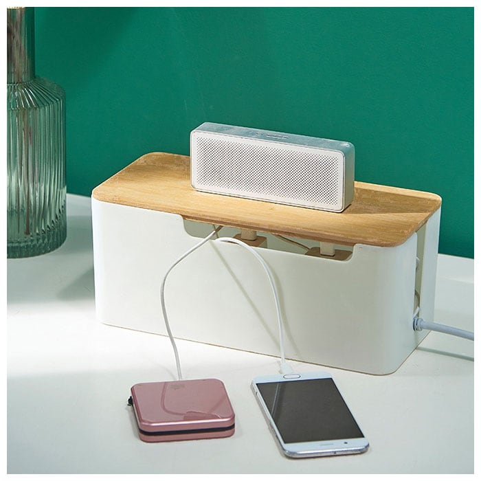・使い方はとっても簡単。ボックス上部から電源タップを収納し、両サイドのケーブル穴からコードを通してフタを閉めるだけ!