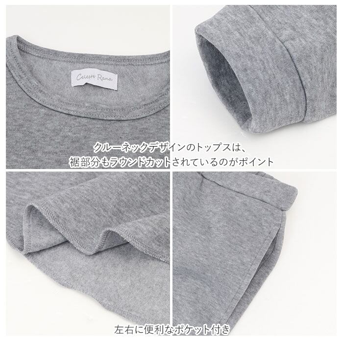 ・クルーネックデザインのトップスは、裾部分もラウンドカットされているのがポイント。